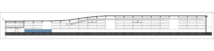 Inoltre sul prospetto est la facciata è ulteriormente movimentata dalla presenza di due pensiline in struttura metallica, una nell’area nord e l’altra verso sud, dove l’edifico gradualmente cambia altezza, passando da un’altezza di colmo massima di 9,40 m ad una minima di 6,65 m, e la copertura si raccorda con quella della pensilina stessa.