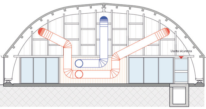 Dall’alto, prospetto est con le canalizzazioni della ventilazione (in rosso mandata, in blu ripresa)