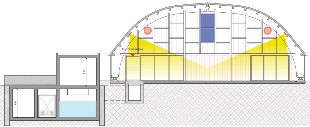 Inoltre, al fine di raccogliere le esigenze del Comune è stato sostituito il sistema di canalizzazione interno al piano vasche collegato all’UTA esistente. I nuovi canali, in tessuto microforato, sono stati posizionati in modo tale da garantire una loro manutenibilità senza dover invadere le vasche e dunque bloccare le attività.