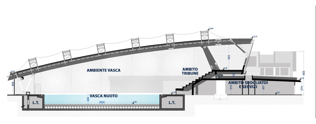 La progettazione ha seguito linee guida già individuate da un progetto comunale a base di gara della progettazione che è stato oggetto di ingegnerizzazione esecutiva completamente eseguita dallo Studio dell’architetto Paolo Pettene e dal suo staff in qualità di noti esperti nel settore natatorio FIN.