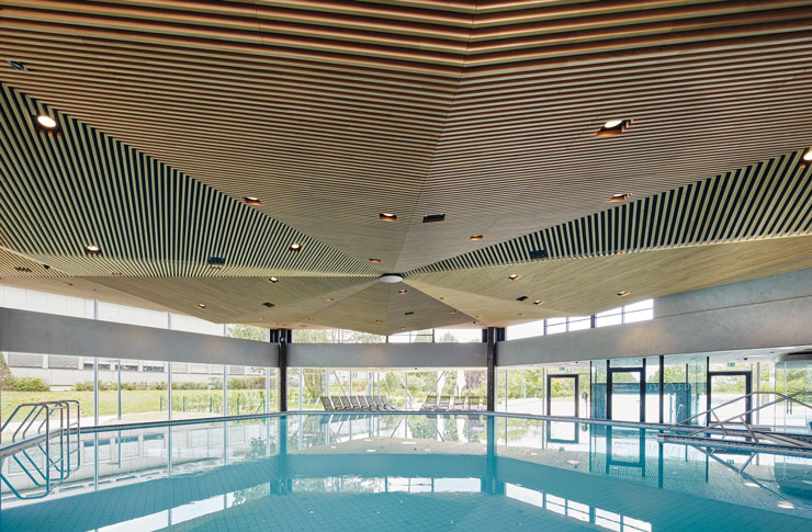 Un soffitto a doghe di legno, disegnato a pieghe, si estende al di sopra della piscina fino alle sue estremità, conferendo all’ambiente interno un’atmosfera molto particolare. Inoltre, le doghe con un materassino in pile inserito garantiscono un’acustica notevolmente migliore.