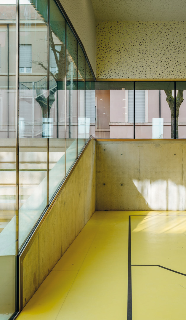 Il volume a doppia altezza della palestra si estende nello spazio del piano superiore, permettendo ai visitatori dei corridoi di godere di una vista sul campo da gioco attraverso una grande vetrata. Da questo punto lo sguardo e poi condotto verso la vetrata al livello inferiore che dà sul cortile interno, creando una continuità visiva e spaziale tra gli ambienti interni ed esterni.
