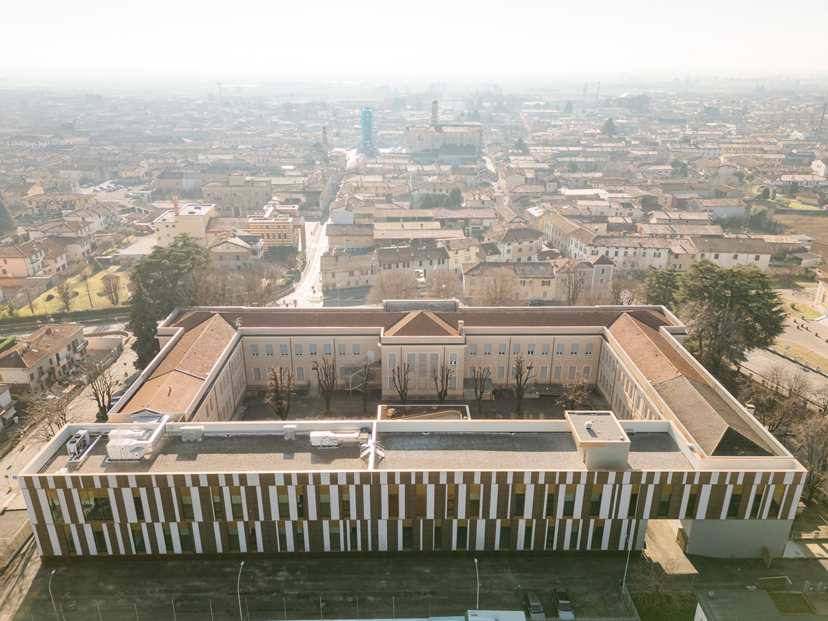 Dall’alto, prospetto nord e prospetto sulla corte interna della scuola di Travagliato (Bs)