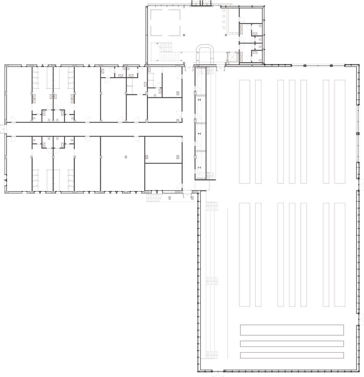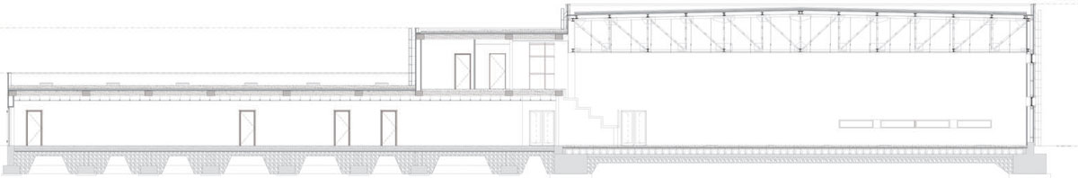 Il secondo corpo della Casa della Scherma di Jesi, l’unico con struttura in cemento armato, anche questo di forma rettangolare, si sviluppa principalmente su un unico piano con altezza interna di 3 metri, a cui si aggiunge un secondo piano che si collega con il corpo dell’atrio. Questo corpo ospita diverse funzioni: servizi igienici, spogliatoi, sala medica, palestra attrezzi, essiccatoio, armeria e magazzini al piano terra, mentre al piano superiore sono posizionati gli ambienti dedicati al personale come gli uffici, la sala riunione. Questo piano, posizionato a quota 3.40 m, è in posto diretto contatto con la Sala Scherma tramite la tribuna.