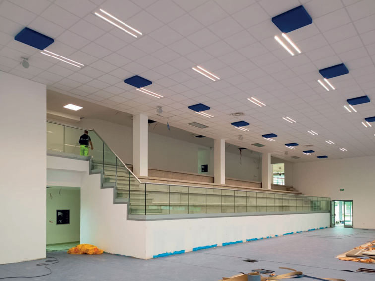 Nello specifico il corpo dell’atrio di accesso è un volume rettangolare a doppia altezza con superficie complessiva di mq 155.4 e altezza interna di 6.05 m. Questo spazio, caratterizzato da un’ampia facciata continua, ospita la reception, ambito centrale dedicato alla collocazione dei trofei e per la narrazione della storia del Club Scherma, ed una zona per il ristoro, con servizi igienici annessi e i collegamenti verticali per accedere al piano superiore dell’edifico.