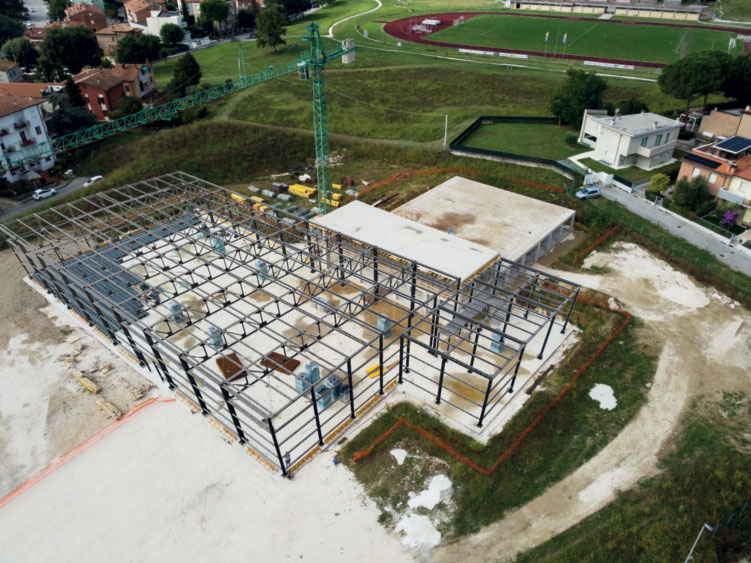 Costruttivamente, le strutture sono realizzate in cemento armato per il corpo spogliatoi e servizi mentre per i corpi della Sala Scherma e l’atrio è stata prevista una struttura in acciaio.