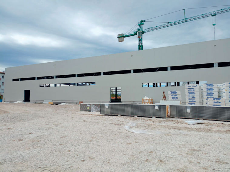 Fasi di lavorazione: in alto, la struttura metallica e i pannelli di facciata;