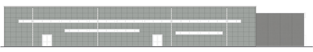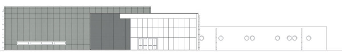 Il corpo della Sala Scherma, ancora una volta di forma rettangolare e con struttura in acciaio, occupa una superficie complessiva di 1376 mq e altezza esterna di 8,55 m.