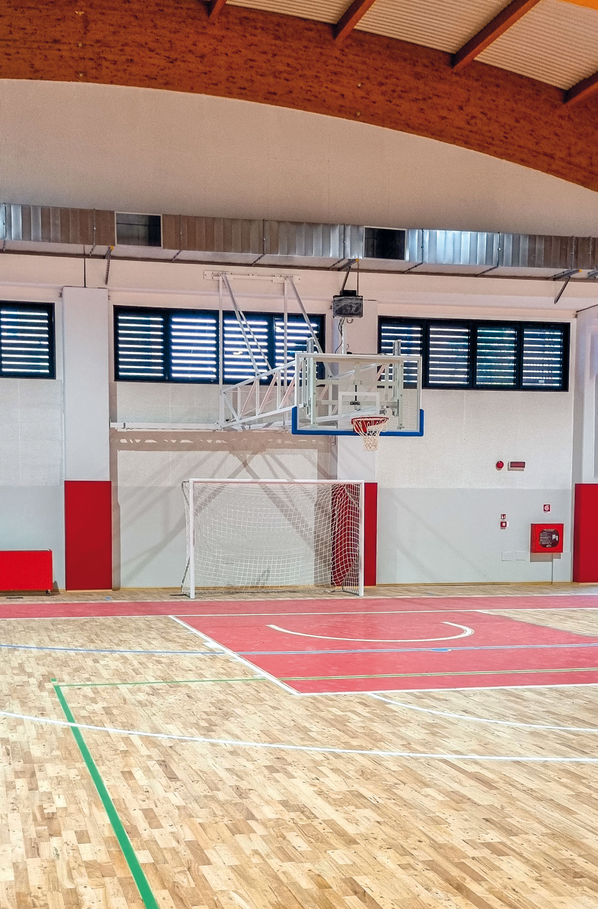 L’area sportiva della palestra di Trecate è pavimentata con parquet di legno multistrato, conforme alla normativa FIBA, per uno spessore totale di 50 mm (oltre 700 metri quadri di AdiBasic22 in essenza Hevea), su cui sono stati tracciati i campi per il gioco della pallacanestro, della pallavolo e del calcio a 5.