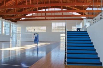 Lo spazio interno dell’impianto sportivo è definito dalla grande copertura in legno lamellare, costituita da un’unica volta a botte che ospita lo spazio di gioco, le gradinate e i servizi, ricavati al di sotto degli spalti e del tutto invisibili, sebbene siano agevolmente e direttamente accessibili dal campo.