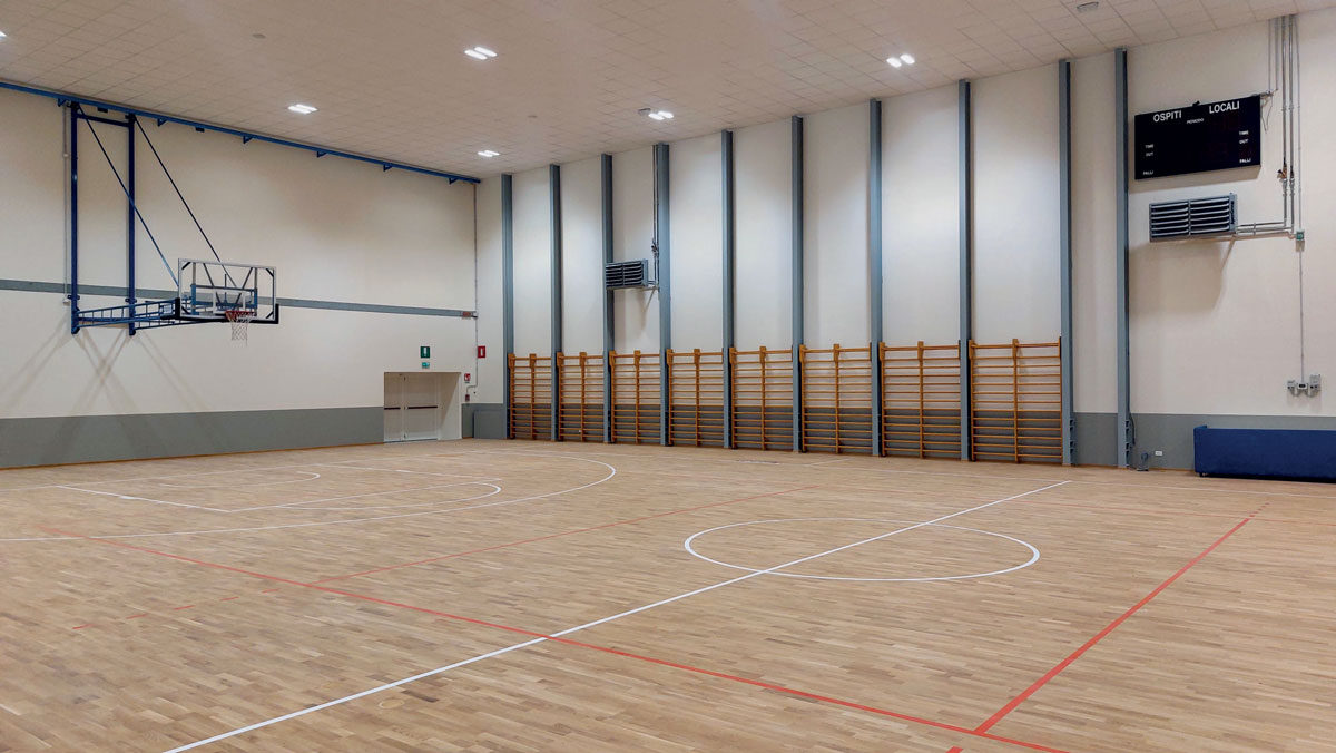 L’intervento ha visto la sostituzione della pavimentazione dell’area di gioco, già in gomma, con l’installazione di un parquet in legno elasticizzato con piano di calpestio in rovere dello spessore di 6 mm, adatto alle diverse pratiche sportive che vengono svolte: dalla ginnastica artistica, alla pallacanestro e pallavolo. Inoltre questo tipo di pavimentazione consente l’installazione del riscaldamento a pavimento, per un maggiore comfort termico dell’area del campo da gioco.