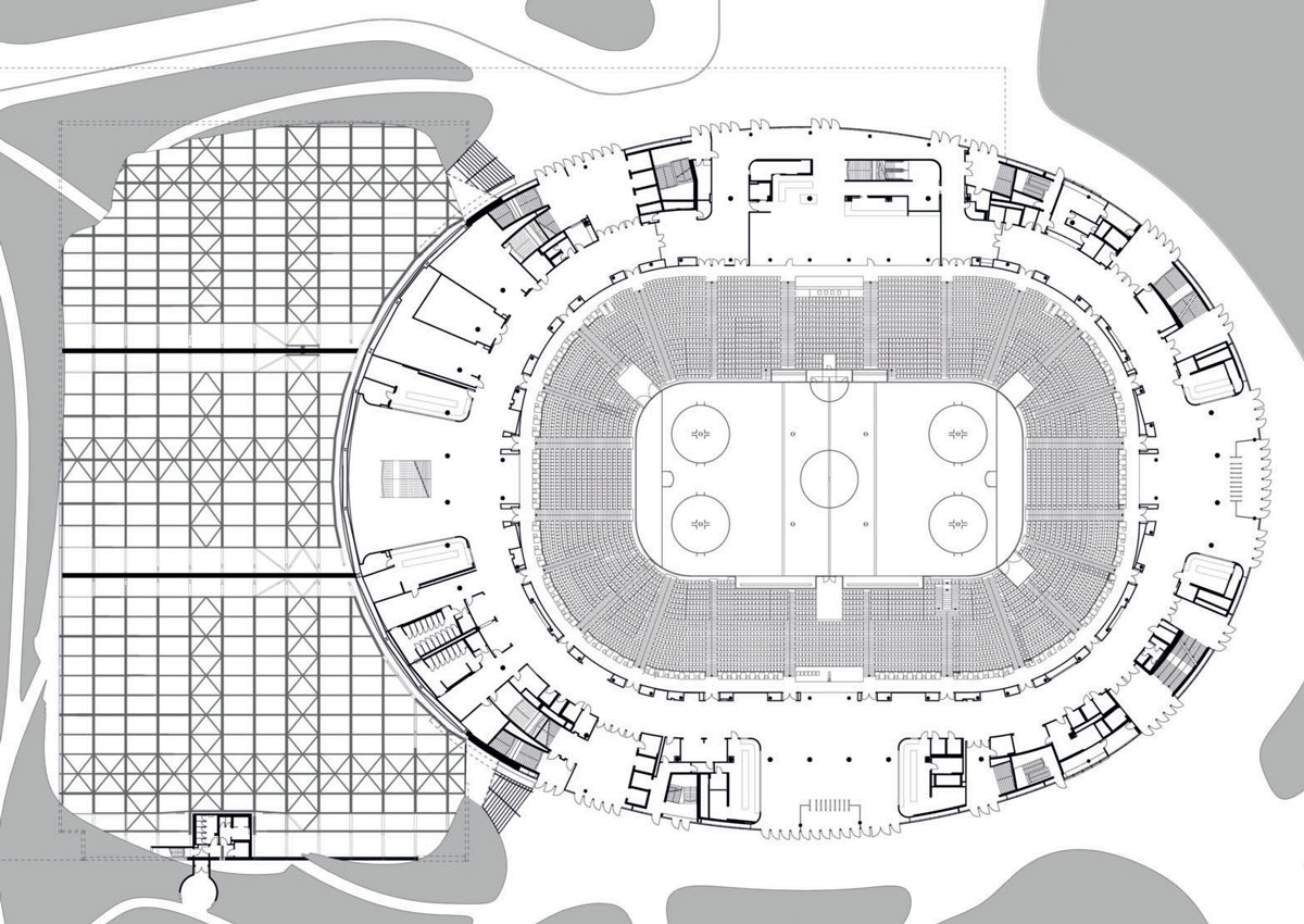 Per consentire l’adattabilità dello spazio interno – da pista di ghiaccio a parterre per il basket – è stato sviluppato un particolare sistema di tribune. Le tribune fisse predisposte per l’hockey su ghiaccio possono essere regolate in altezza e inclinazione; per il basket la pista viene coperta e su di essa vengono posizionate delle tribune mobili.