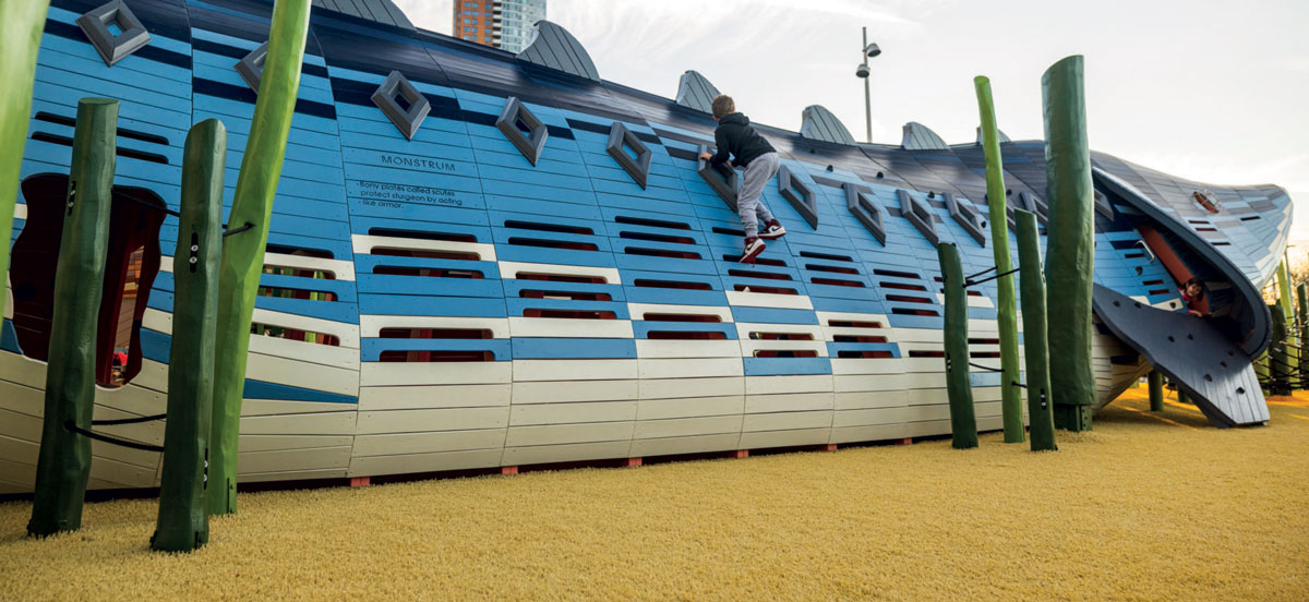 Queste strutture ludiche altamente interattive evocano un’immersione nella vita del fiume Hudson, invitando e stimolando i bambini a esplorare e imparare. Le creature lunghe 24 metri possono essere scalate sia all’esterno che all’interno, i bambini possono viaggiare attraverso questi pesci in via di estinzione, imparando a conoscere la loro anatomia, il loro habitat e la loro natura mentre giocano.