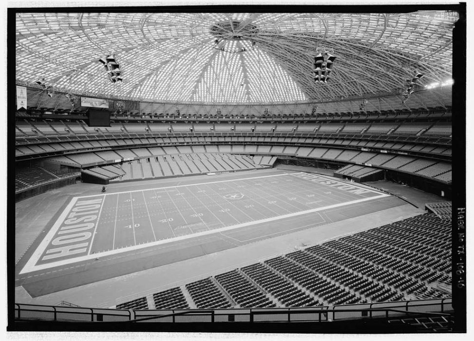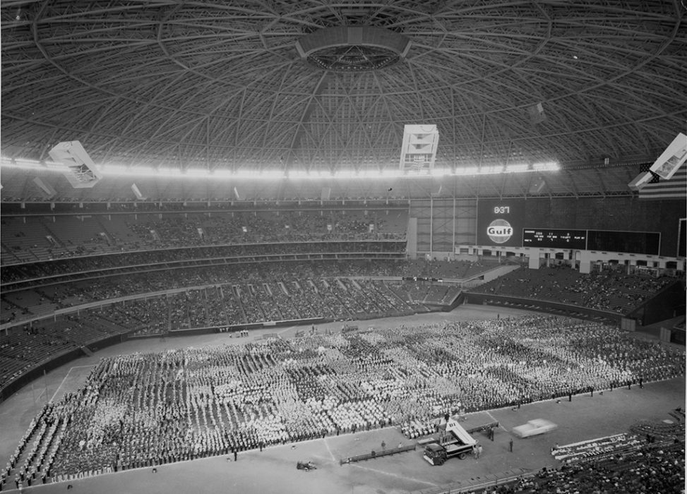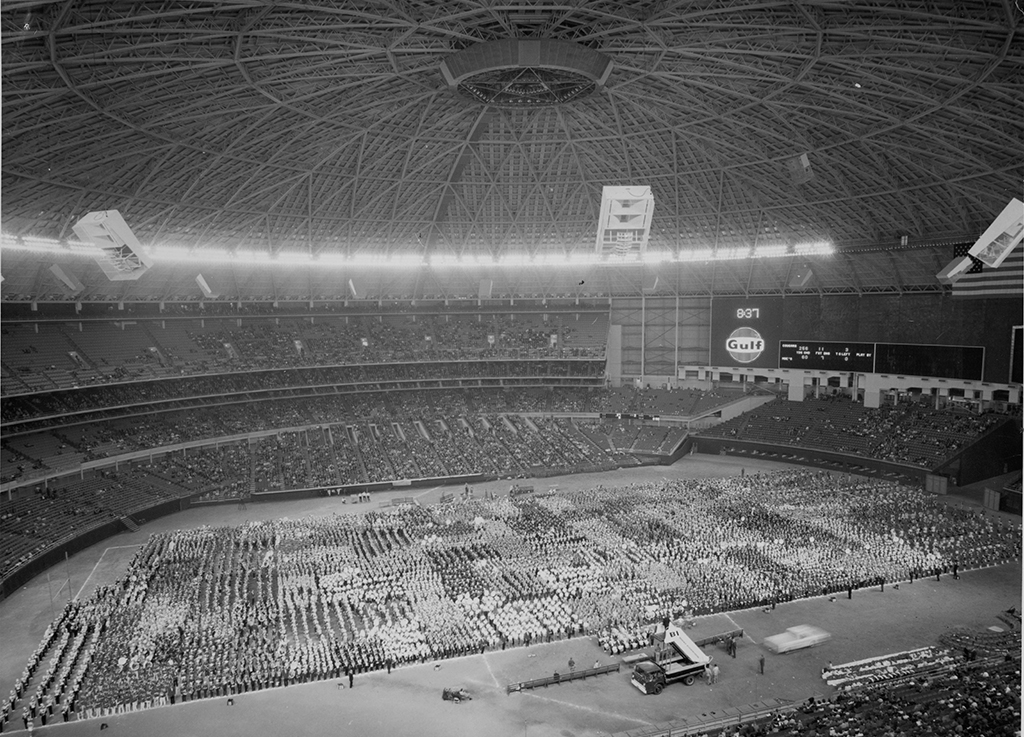 Due immagini d’epoca dell’Astrodome di Houston: a sinistra in allestimento sportivo, a destra per una parata di bande musicali (Houston Public Media).