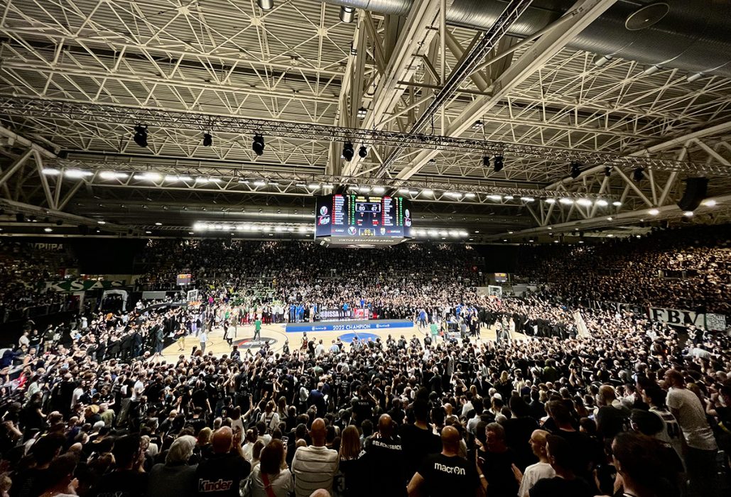 A sinistra, la Virtus Segafredo Arena di Bologna durante l’EuroCup 2022 (foto Nick.mon). A destra, l’arena di Santa Giulia a Milano nell’allestimento per i Giochi Olimpici Invernali 2026 (foto BG/Tsport).