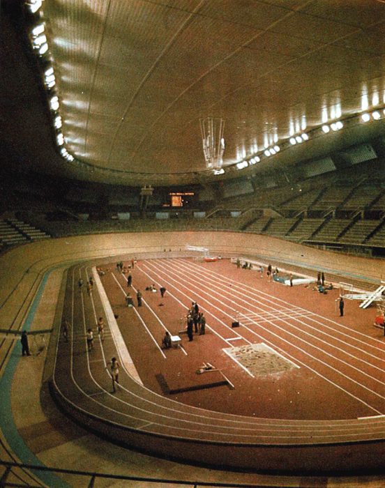 A pianta ellittica con assi di 144 e 146 metri, senza colonne intermedie e con una volta a luce unica di 140 metri, il palazzo era costituito da una struttura in cemento armato con 24 ingressi e “curve” sopraelevate per la presenza della pista ciclistica in legno, lunga 250 metri e larga 7. Era dotato, inoltre, di una pista di atletica in tartan da 4 corsie, di un’altra da 6 per le gare di velocità, delle attrezzature per salto in alto, con l’asta, in lungo e triplo e getto del peso e del campo da basket e pallavolo in parquet. Un’arena multifunzionale che per certi versi, all’epoca, era all’avanguardia, nonostante le numerose critiche che attirò per i costi di gestione, naturalmente elevati per un colosso del genere, e l’assenza di alcuni comfort essenziali come l’aria condizionata. Inoltre, per pallacanestro e volley, la distanza degli spettatori dal rettangolo di gioco era notevole.