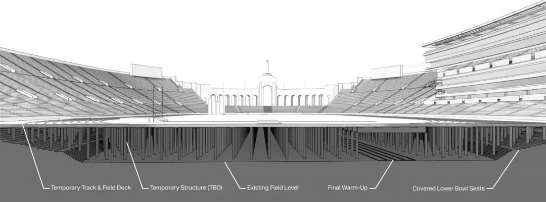 Resta aperta la necessità di introdurre, almeno temporaneamente, la pista di atletica all’interno dell’ovale, dato che qui sono previste anche le gare di atletica leggera olimpica e paralimpica. L’intervento in programma (per un investimento di un centinaio di milioni di dollari) prevede la realizzazione di una nuova superficie, rialzata di circa 3,30 metri sul piano attuale di gioco, che andrebbe a ricoprire le prime file di sedute – le quali altrimenti non consentirebbero uno spazio sufficiente per far correre la pista nella lunghezza regolamentare. Questo plateau temporaneo dovrebbe essere sorretto da migliaia di colonne e piastre metalliche. Lo spazio sottostante ospiterebbe l’area di riscaldamento e la call-room, dove gli atleti si registrano prima della gara. Una piattaforma elevatrice porterebbe gli atleti al livello del campo per un’entrata spettacolare.