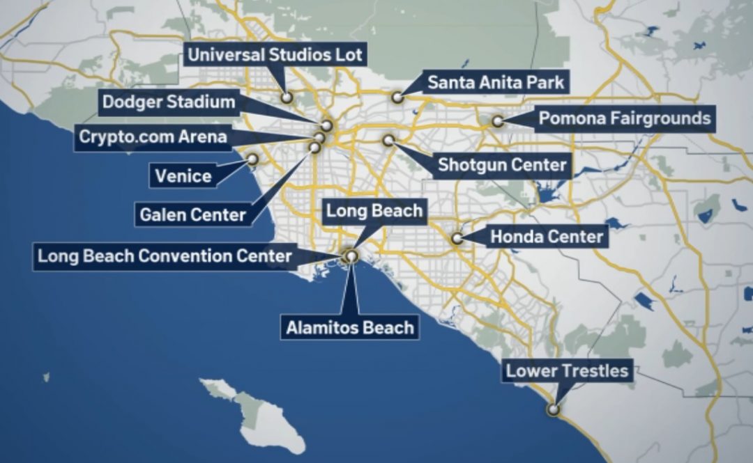 Il programma generale prevede 40 sedi di gara, distribuite in varie zone della conurbazione di Los Angeles. Come raccomandato dal CIO (ma non sempre seguito…), la candidatura statunitense è stata improntata all’utilizzo di strutture già esistenti, o comunque già in costruzione, unite alle inevitabili strutture temporanee da prevedere per taluni sport soprattutto outdoor.