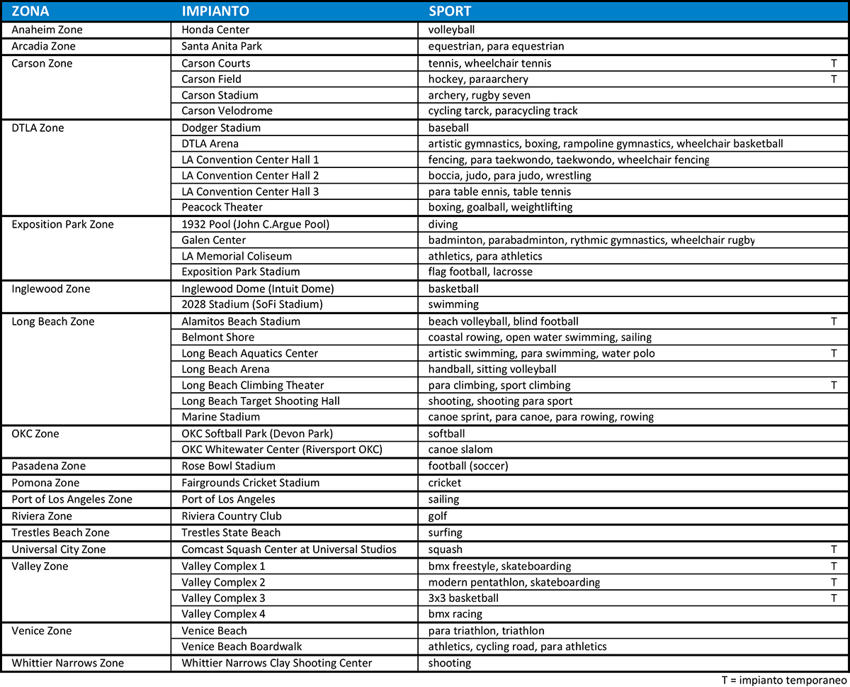 Il programma generale prevede 40 sedi di gara, distribuite in varie zone della conurbazione di Los Angeles. Come raccomandato dal CIO (ma non sempre seguito…), la candidatura statunitense è stata improntata all’utilizzo di strutture già esistenti, o comunque già in costruzione, unite alle inevitabili strutture temporanee da prevedere per taluni sport soprattutto outdoor.