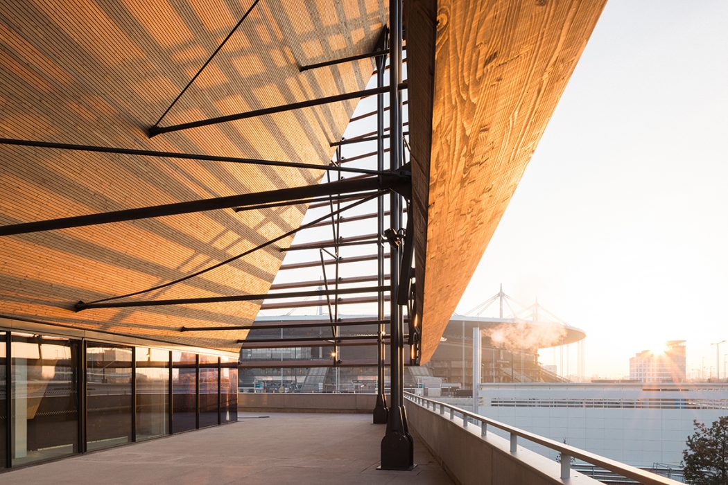 Le lamelle in legno definiscono uno spazio intermedio che permette di proteggere gli spazi esterni e di utilizzarli in diversi modi: durante gli eventi sportivi accolgono e proteggono gli spettatori e nella fase di legacy propongono nuovi spazi per praticare sport (lezioni di yoga, boot camp) o per incontrarsi (terrazze).
