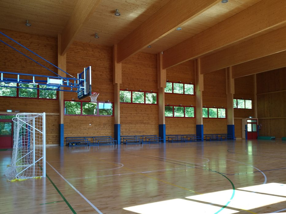 La copertura della palestra, sempre lignea, è costituita da un solaio piano in pannelli Xlam fissati direttamente sulle travi principali, di sostegno ad un sistema di reticolari in legno ad arco ribassato, con soprastante manto in pannelli curvi di lamiera grecata.