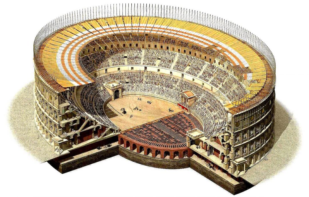 Se andiamo al passato, il Colosseo di Roma, tipica arena per spettacoli e giochi, lungo 189 metri e largo 156, intorno a un’arena di 76×46, poteva ospitare fino a 50.000 spettatori (immagine a destra, da eduki.com).