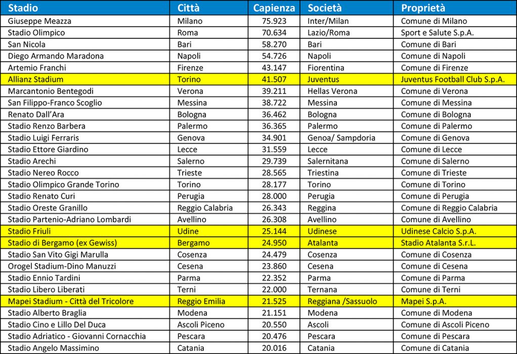 Glis tadi italiani con oltre 20.000 posti dichairati per la stagione 2024/25. In giallo gli stadi di proprietà.