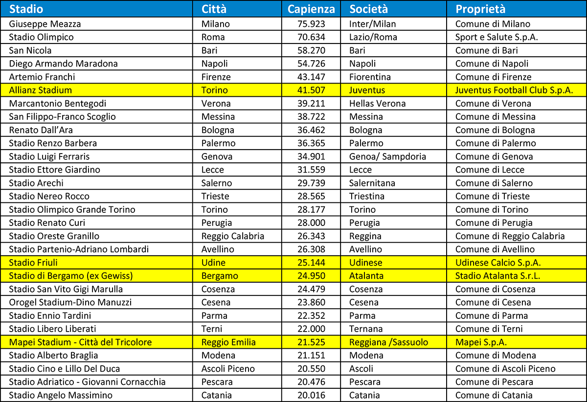 Glis tadi italiani con oltre 20.000 posti dichairati per la stagione 2024/25. In giallo gli stadi di proprietà.