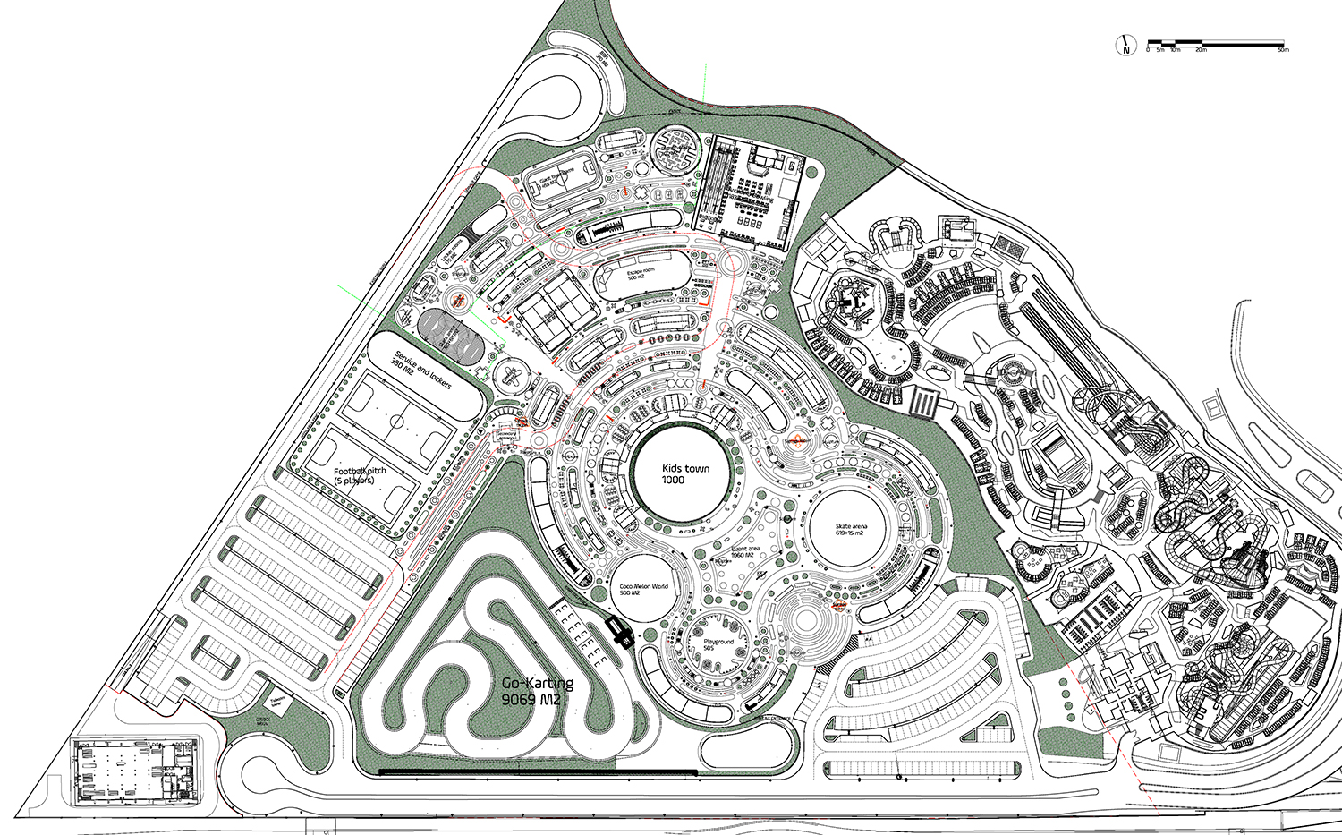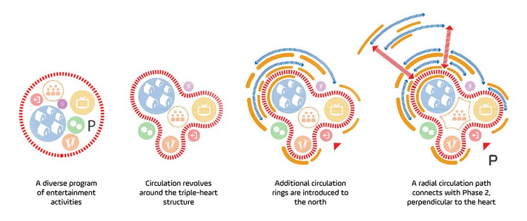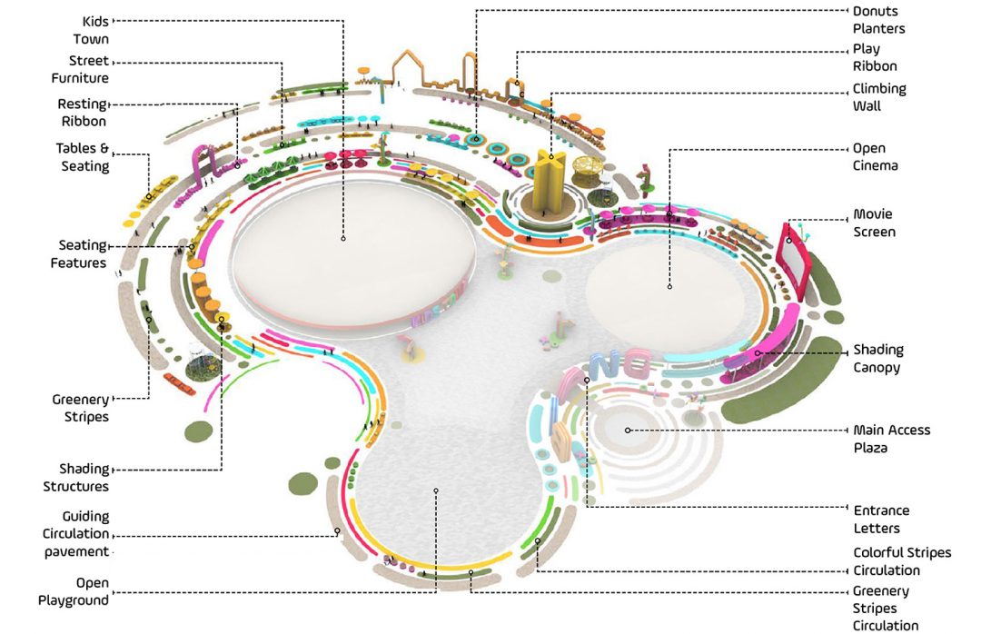 Il masterplan presenta una struttura a “triplo cuore” con tre zone principali: uno spazio multifunzionale per eventi, un parco giochi e Kids Town, tutte gravitanti attorno alla Central Plaza e pensate su misura per il pubblico più giovane. Questi spazi sono disposti con cura per incoraggiare le interazioni sociali spontanee e l’espressione di sé, elementi fondamentali della filosofia di 100architects volta a creare spazi pubblici che favoriscano il coinvolgimento della comunità. Il design dinamico invita i visitatori a esplorare, giocare e socializzare, rendendolo uno spazio ideale per incontri sociali e per l’espressione dei giovani.