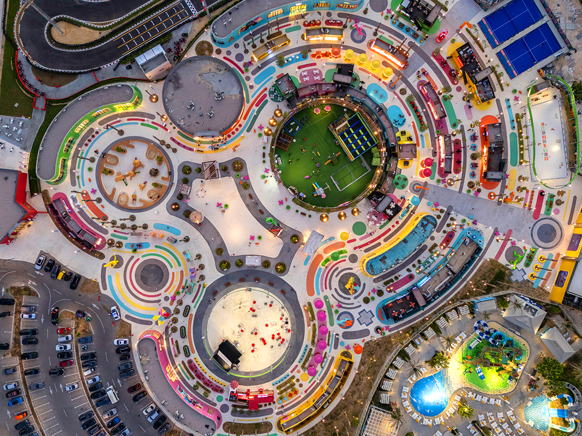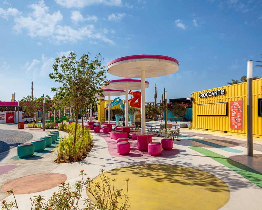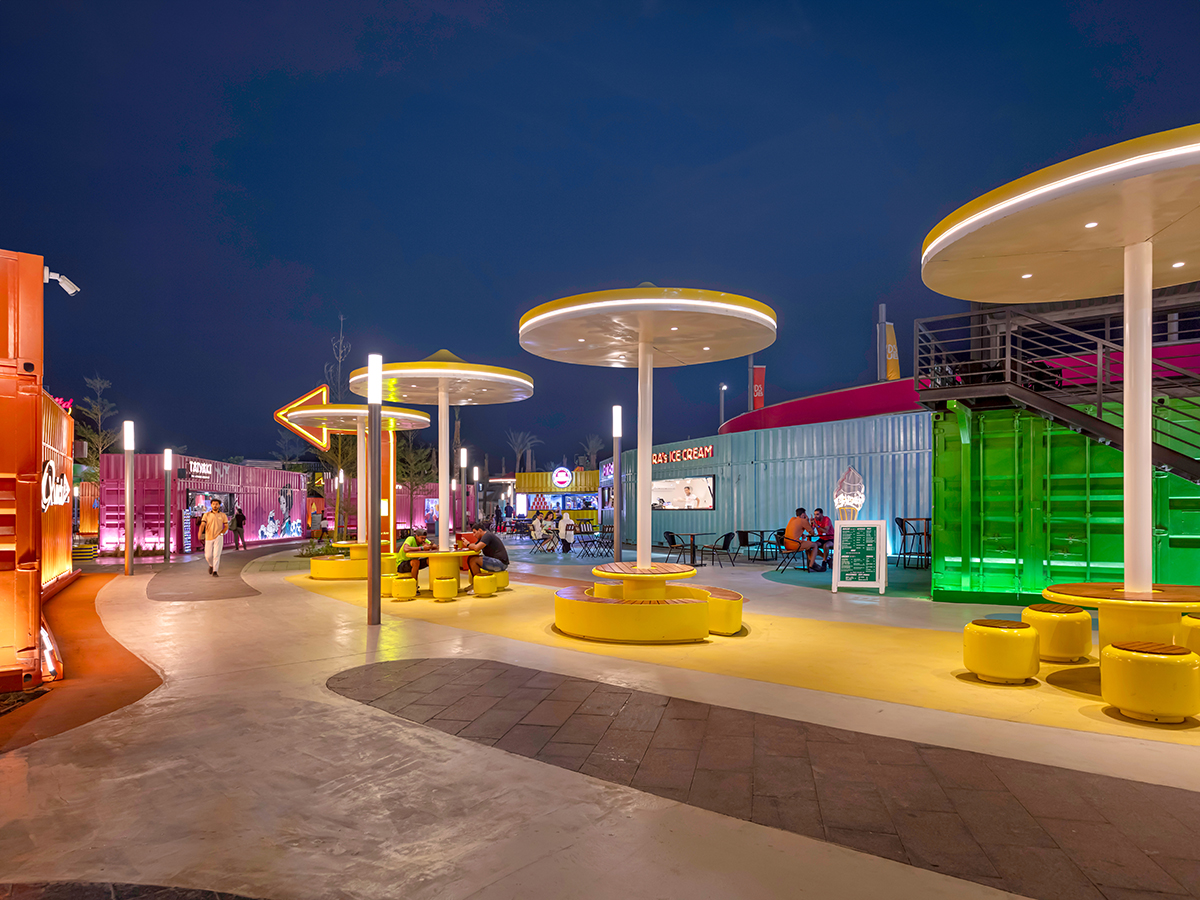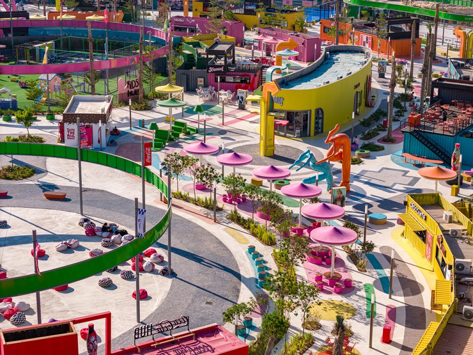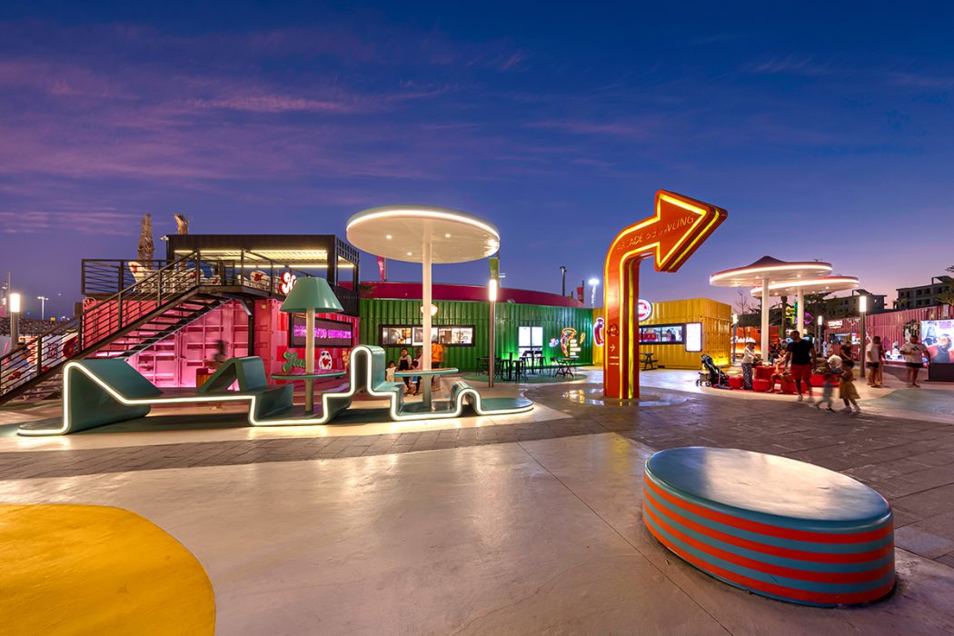 Oltre a queste attrazioni principali, The Hub offre una vasta gamma di attività, tra cui un cinema all’aperto, una pista di go-kart, una pista di pattinaggio a rotelle, campi sportivi, una sala giochi e spazi pubblici flessibili progettati per consentire l’allestimento temporaneo di mercatini, concerti e laboratori. Gli spazi dedicati alla ristorazione e al commercio al dettaglio occupano rispettivamente 10.000 m² e 15.000 m², con punti di ristoro in container e negozi al dettaglio a tema locale, tutti progettati per integrarsi perfettamente con l’estetica vivace. Questo approccio modulare ha consentito una costruzione rapida, mantenendo al contempo un sorprendente tocco industriale che risuona con i visitatori più giovani.
