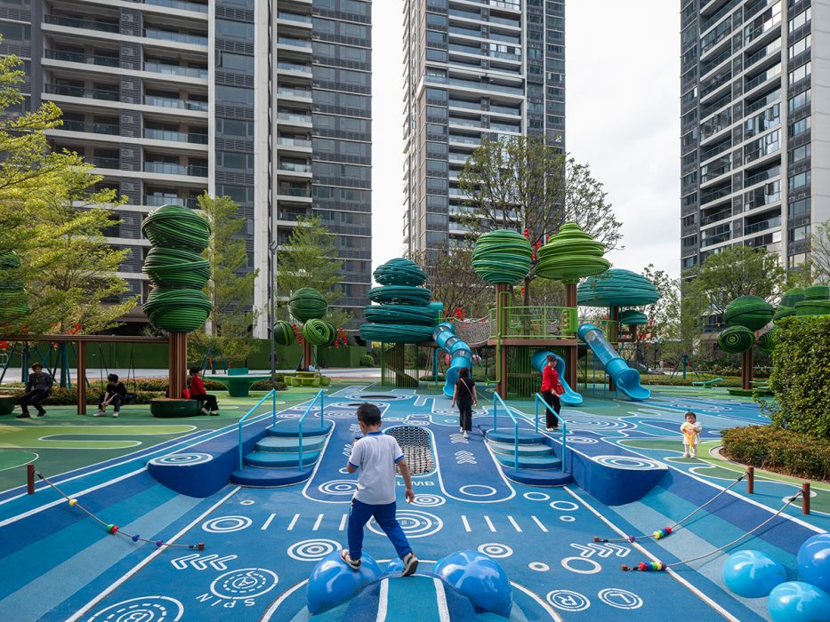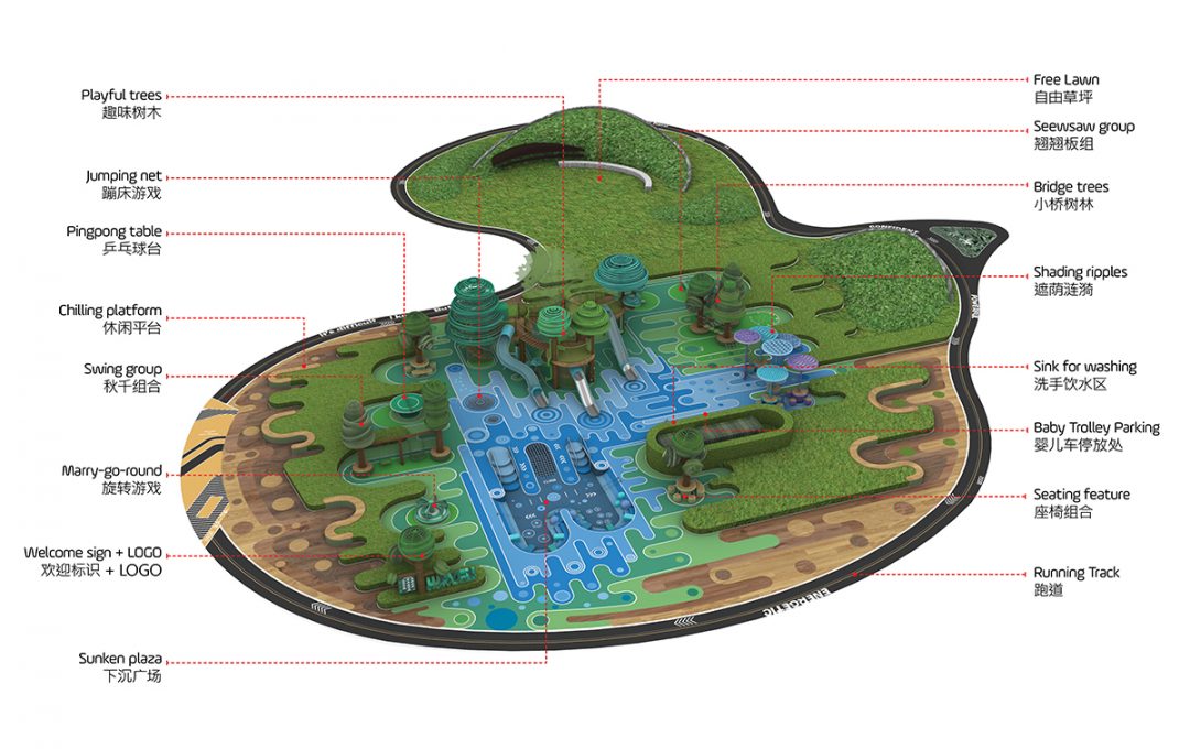 Ispirato al movimento sinuoso dei fiumi, il terreno è decorato con linee colorate e curve che scorrono in tutto lo spazio. Queste linee definiscono un “paesaggio filiforme” che unisce più zone – piazze ludiche, piattaforme rilassanti e percorsi di circolazione – in un ambiente continuo e visivamente accattivante.