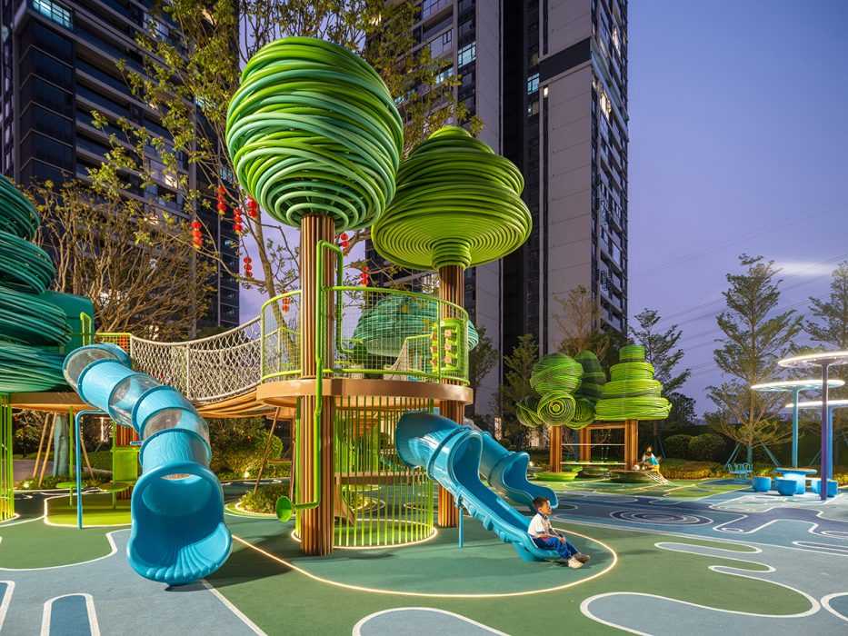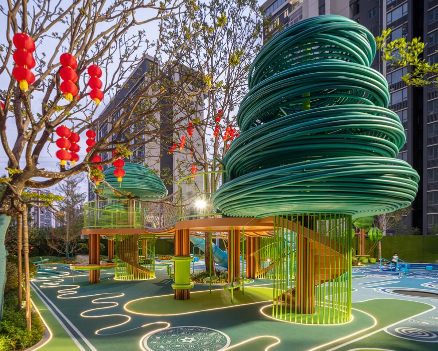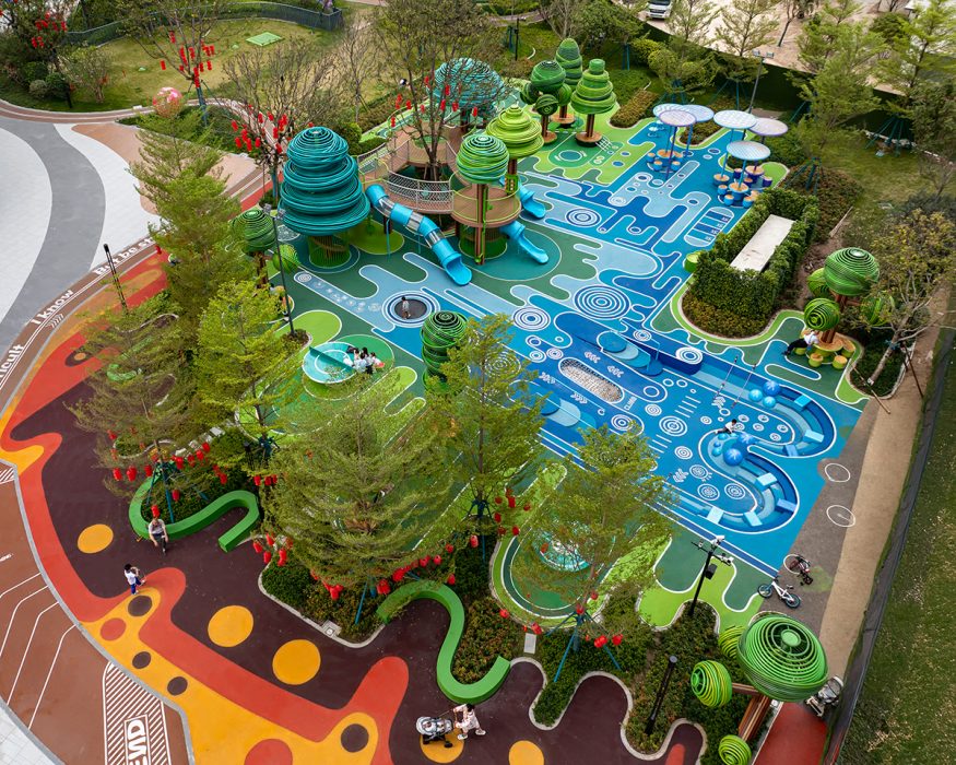 Ispirandosi ai diversi ambienti naturali di Guangzhou, il progetto interpreta due elementi fondamentali, la foresta e l’acqua che scorre, attraverso geometrie astratte e forme scultoree. Il risultato è un parco giochi simile a una foresta, dove ogni elemento sembra essere stato costruito con fili metallici che avvolgono gli alberi per formare volumi altamente tattili e ricchi di texture.