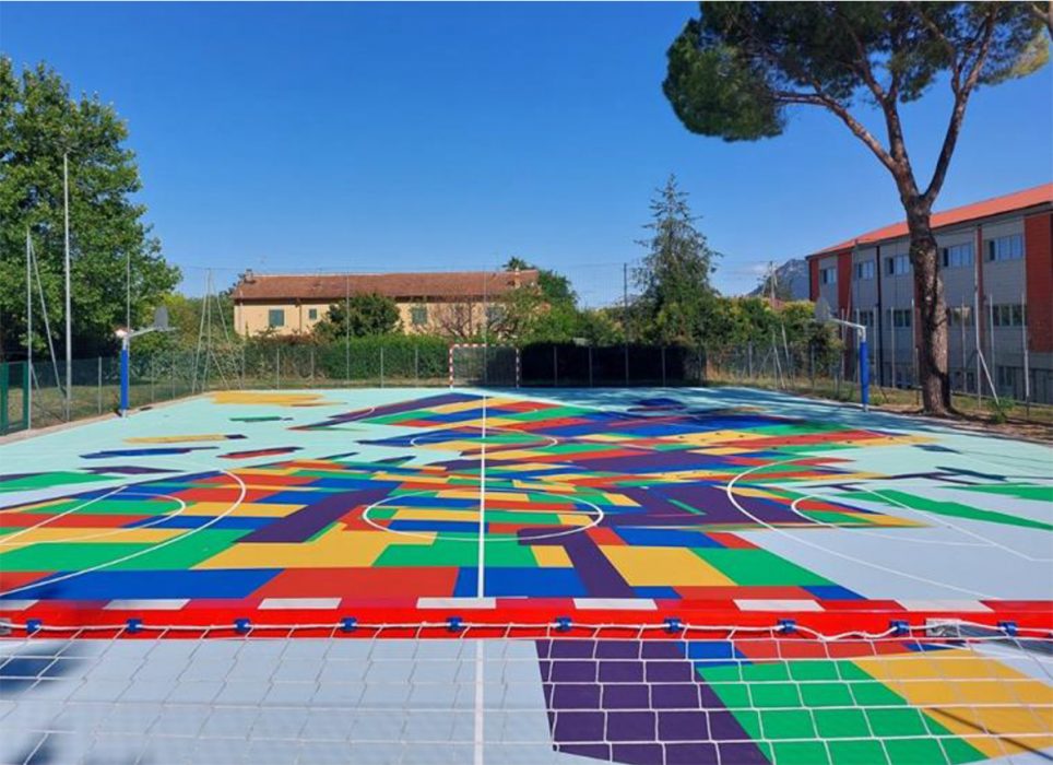 Quartiere Cospea – arena e skatepark: qui il progetto ha previsto un playground con disegno a effetto tridimensionale, con porte per calcio e canestri oltre a un’area skate park laterale.