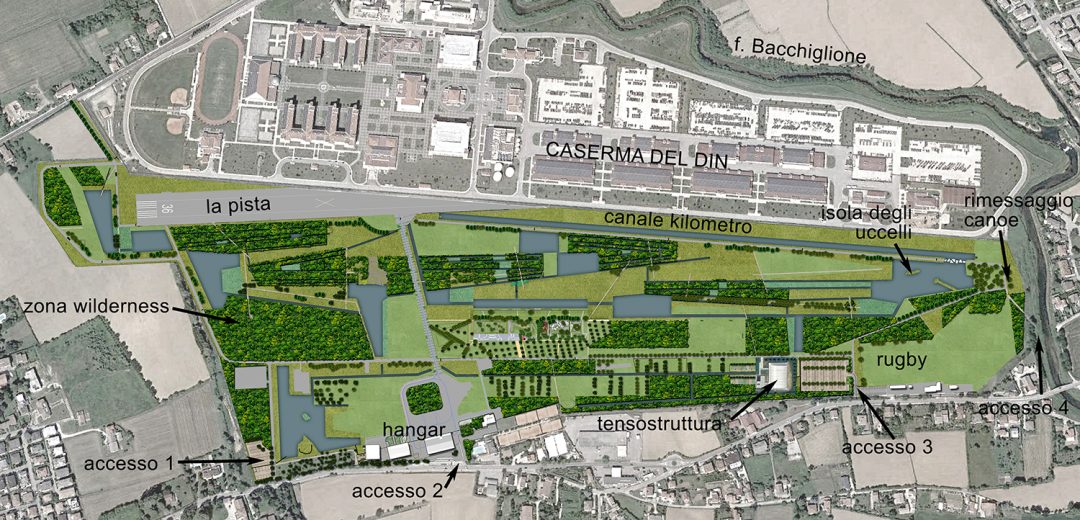 l progetto riguarda una superficie complessiva di 650.000 mq corrispondente a oltre metà dell’ex infrastruttura dismessa dell’Aeroporto Dal Molin. La grande dimensione e le caratteristiche specifiche del parco lo candidano a diventare un parco metropolitano, un polo attrattivo a scala territoriale. Questa opera di trasformazione urbanistica e paesaggistica non è solo un tentativo di riconquista della natura dove l’acqua e la vegetazione sono protagoniste indiscusse, ma ha anche l’ambizione di essere un nuovo fulcro del sistema del verde della città di Vicenza, fungendo da congiunzione tra la città storica, i comuni adiacenti e un’area territoriale ancora più vasta.