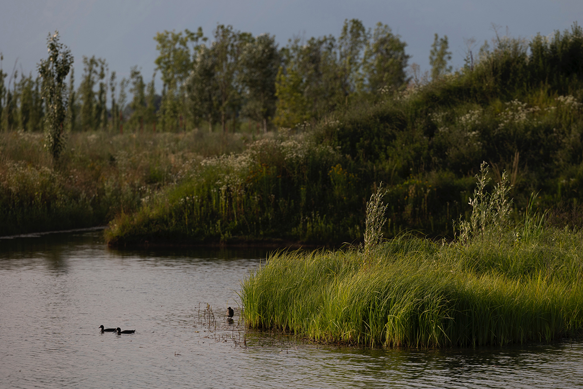 Il parco è stato progettato come un grande bacino di laminazione, capace di contenere e rilasciare lentamente fino a 100.000 metri cubi d’acqua. L’efficiente gestione delle risorse idriche, unita all’istituzione di nuovi ecosistemi umidi, va oltre il semplice drenaggio urbano: crea infatti nuovi spazi vitali per una ricca biodiversità, animale e vegetale. Grazie a questa fitta rete d’acqua, infatti, la fauna locale ha avuto l’opportunità di ripopolare rapidamente l’ambito, che si è arricchito non solo di uccelli legati all’ambiente acquatico, ma anche di altre specie ornitiche, anfibi, pesci, molluschi, artropodi insetti e mammiferi di piccola taglia.