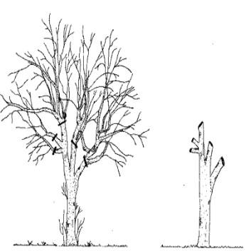 Infine la capitozzatura (figura a destra) è una potatura estrema a cui si deve ricorrere in condizioni straordinarie. Deve perciò essere il male minore ed estremo per evitare il taglio dell’albero.