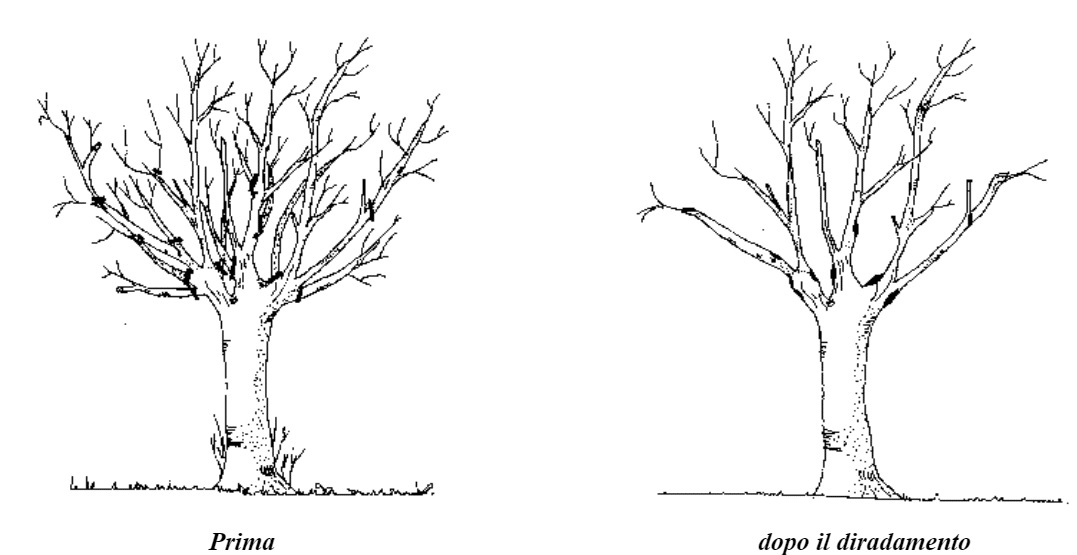 Il diradamento, asportando anche parte della porzione centrale della chioma, favorisce la benefica azione di contatto dei raggi solari ed abbassa il tasso di umidità fra le foglie limitando gli attacchi parassitari e consentendo una migliore lignificazione delle branche.