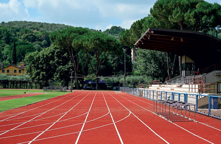 Al contorno di questo è stato realizzato il tracciato per l’impianto di esercizio per l’atletica leggera (pista e pedane).