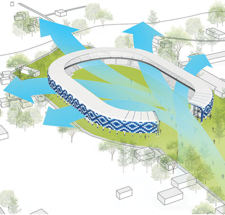 Lo stadio aperto consente un accesso libero e senza ostacoli e amplia in modo significativo lo spazio pubblico esistente all’interno della città . Le strutture sono spazi comuni e l’estremità aperta e le grandi aperture periferiche consentono alle brezze naturali di fluire e rinfrescare gli spettatori, fornendo l’ombra necessaria per gli incontri e le attività sotto il sole tropicale.