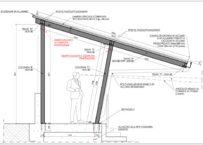 Insieme al lavoro sulla superficie dei campi, è stata realizzata una porzione di copertura per la tribuna spettatori, con una superficie in pianta di circa 22×5 m, centrata rispetto al terreno di gioco, con struttura metallica e copertura in lamiera grecata coibentata, che consente di avere 150/200 posti a sedere coperti.